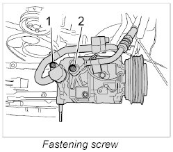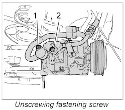 1. Unscrew the fastening screw -2- on the compressor.