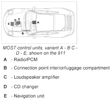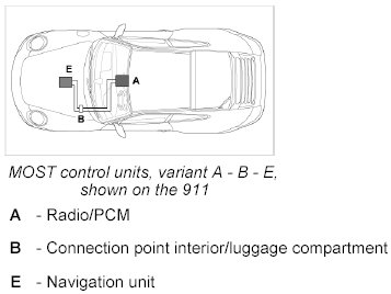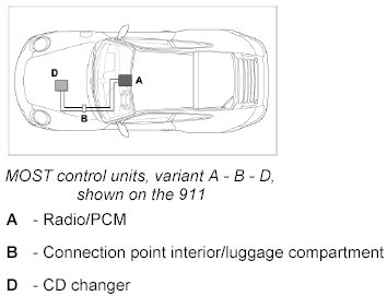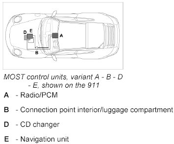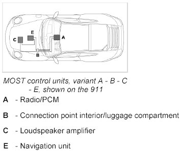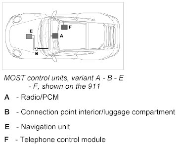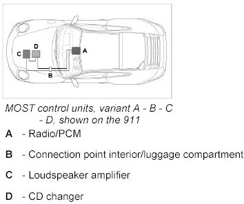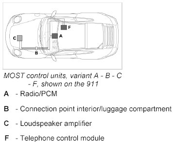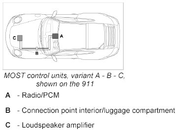 The graphic clarifies the cabling of the individual MOST control units which vary according to their equipment.