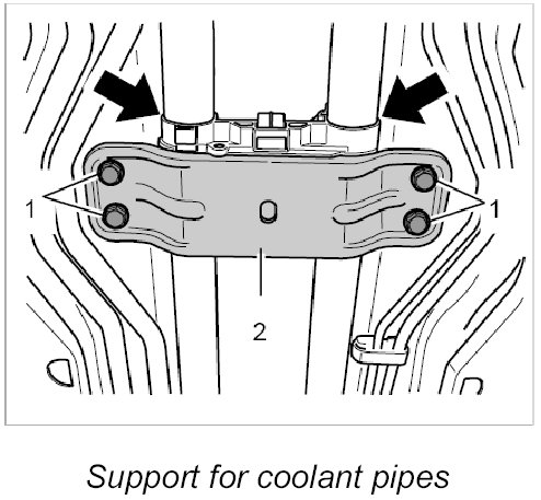 6. Fit coolant pipes in centre tunnel. Secure sheetmetal holder. - Tightening torque: 65 Nm (48 ftlb.)