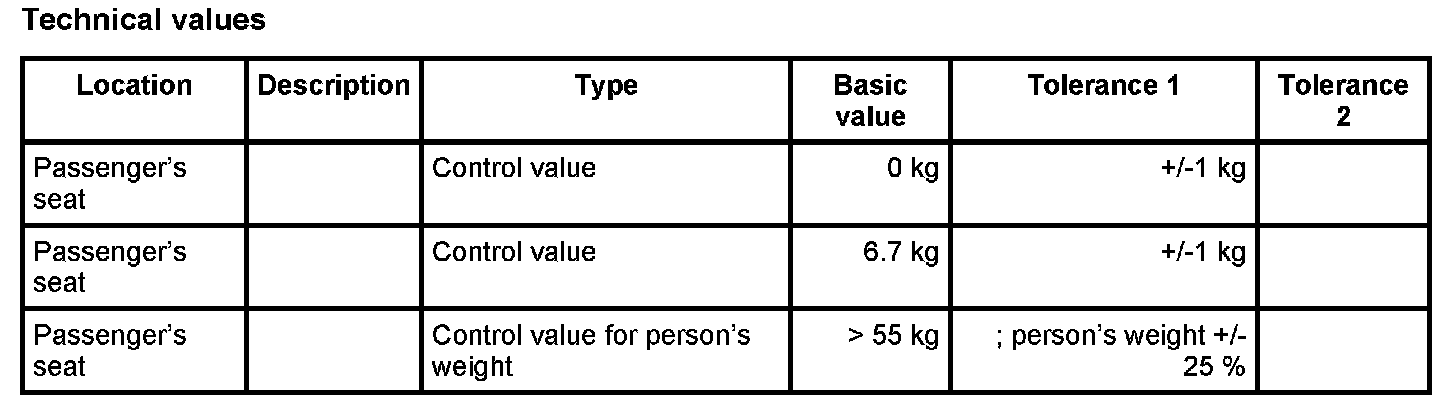 10.1.1. If there is no weight on the passenger's seat, compare values (see table below) using the PIWIS Tester. The Passenger Airbag Off indicator light in the centre console must not come on.