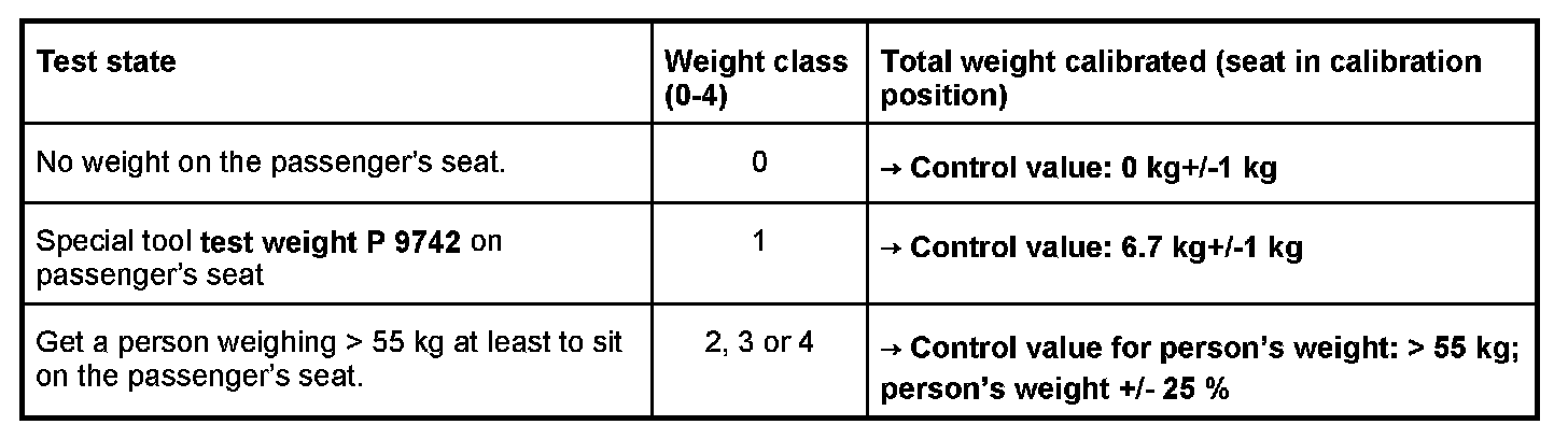 10.1.2. Place the special tool test weight P 9742 on the passenger's seat. The Passenger Airbag Off indicator light in the centre console must come on. Compare values (see table below) using the PIWIS Tester.