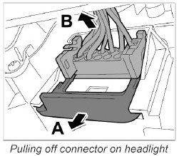 3.2. Pull off connector on headlight -arrow B-.