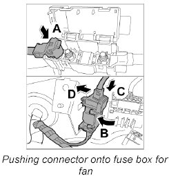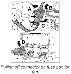 2.3. Pull off connector on fuse box for fan -arrow D-.