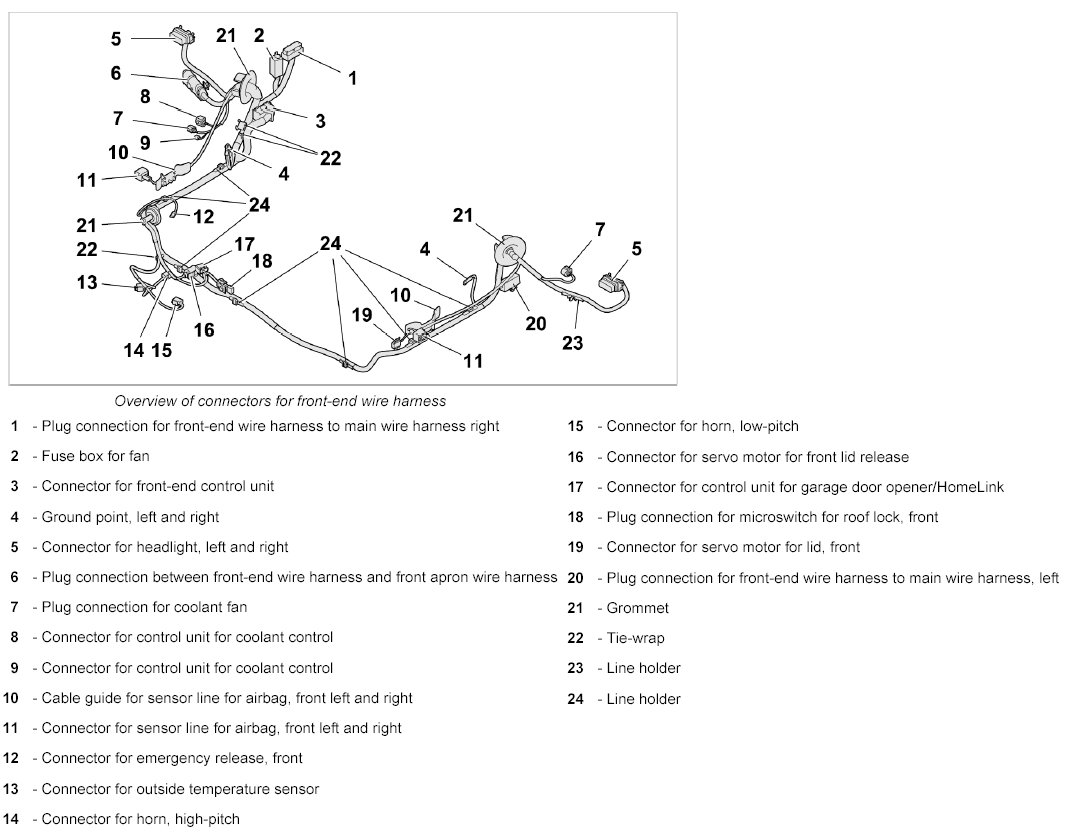- The wire harness for front end spare parts scope means the scope for fully-equipped vehicles. Depending on the vehicle equipment, connectors not required are tied to the wire harness for front end using tie-wraps.