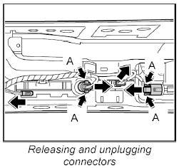 1. Release electric connectors for the equipment versions (e.g. cigarette lighter, interior sensor etc. -A- and unplug.