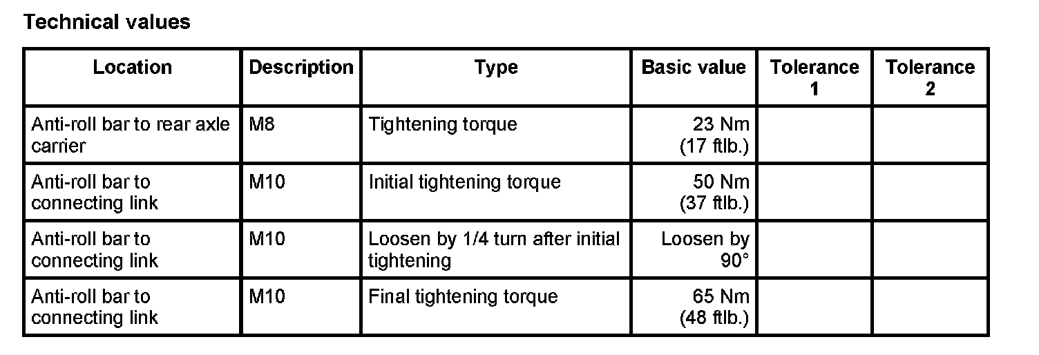 Always tighten the connecting links (suspension/stabilizers) in three steps (Step 1: tighten to 50 Nm (37 ftlb.). Step 2: loosen by 90 degrees. Step 3: tighten to 65 Nm (48 ftlb.))!