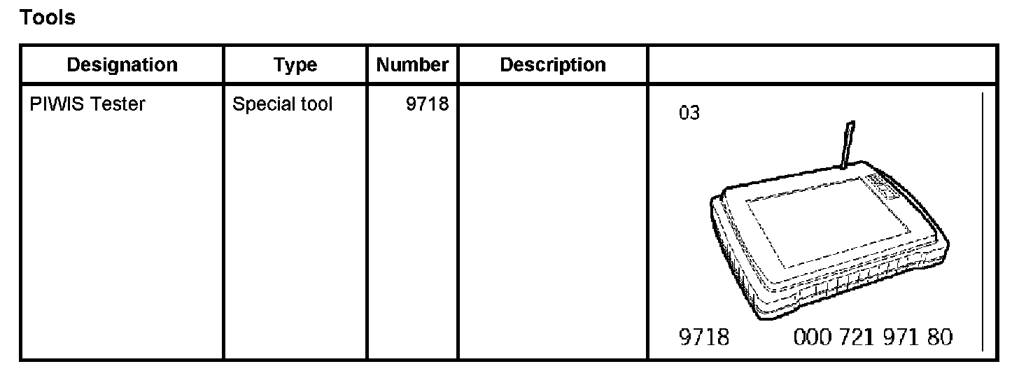 If the control module for the tire pressure monitoring system is replaced, it must be programmed using the PIWIS Tester 9718. This will ensure that the control module is taught for the relevant vehicle, country version and equipment.