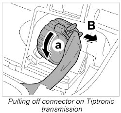 3.1. Release connector on Tiptronic transmission by turning anti-clockwise -Arrow a- and remove -Arrow B-.