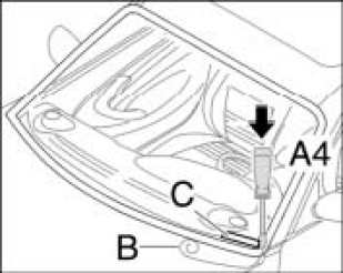 1. Push through adhesive bead on the glass on the edge of the vehicle identification number -C- with the awl -A4- from the inside to the outside. Guiding cutting thread into the passenger compartment.