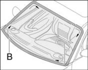 1. Pull cutting thread -B- in the direction of the arrow through the gap between the glass and the body. Use filler if necessary.