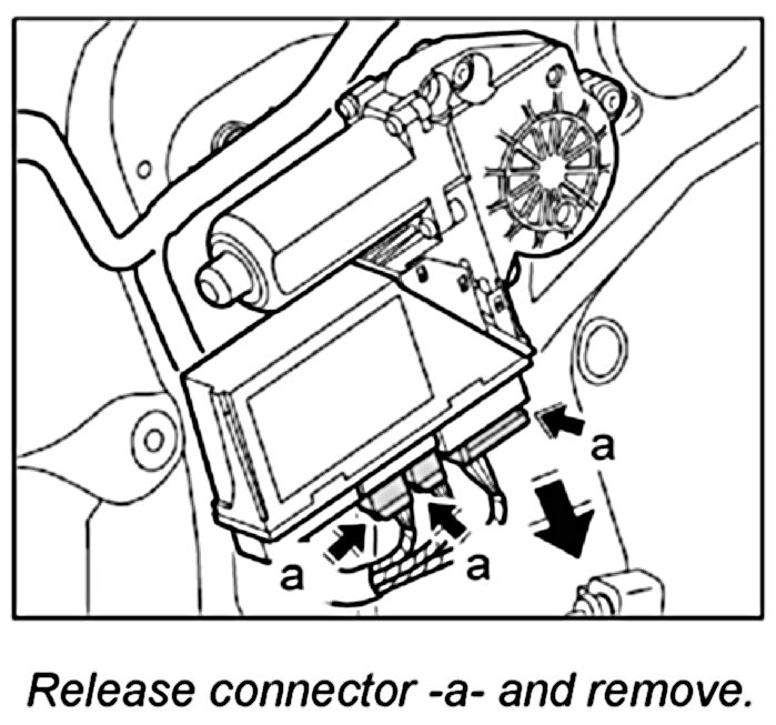 2. Unlock electric connector -a- and disconnect from power window motor.