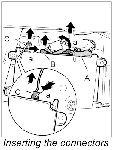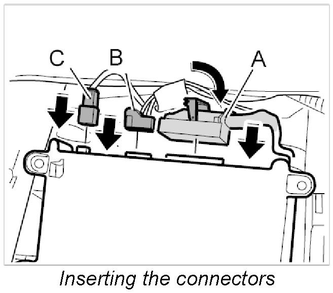 2. Push in electrical plug connections -C, B - until plugs are felt to engage.
