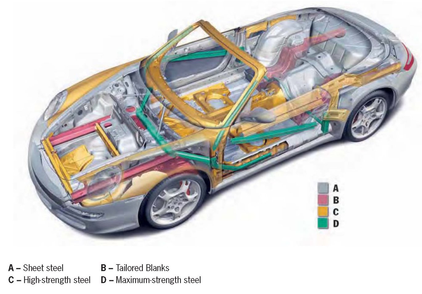 BodyshellThe purpose of redesigning the bodyshell of the new 911 Carrera/S Cabriolet was to further increase rigidity compared with the previous model and also to further improve passive safety in the event of a frontal or offset collision (frontal collision with head-on impact on one side of the vehicle).