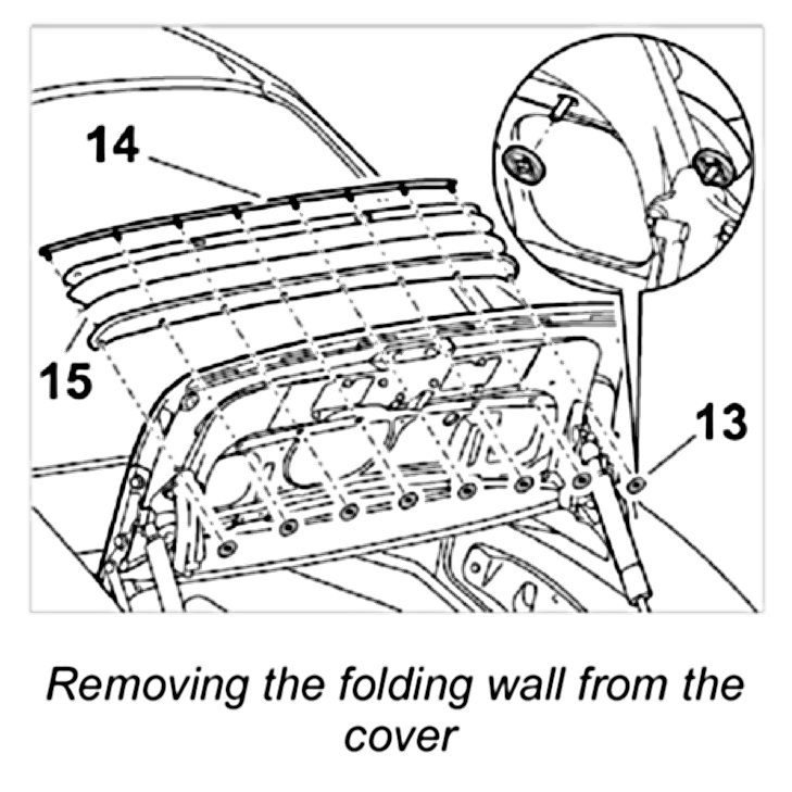 2. Remove the fastening rail -14- and the folding wall -15- from the cover towards the rear.