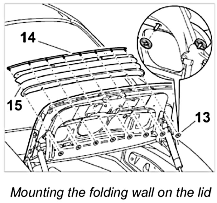 1. Position the fastening rail -14- on the folding wall -15- and the rear lid.
