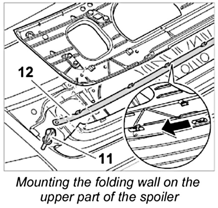 1. Insert the rail -12- with the folding wall into the lower part of the spoiler in -direction of arrow-.