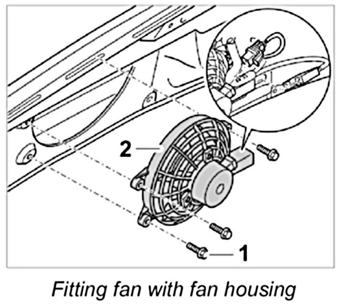 2. Connect plugs for fan and engine compartment lighting on the fan housing.