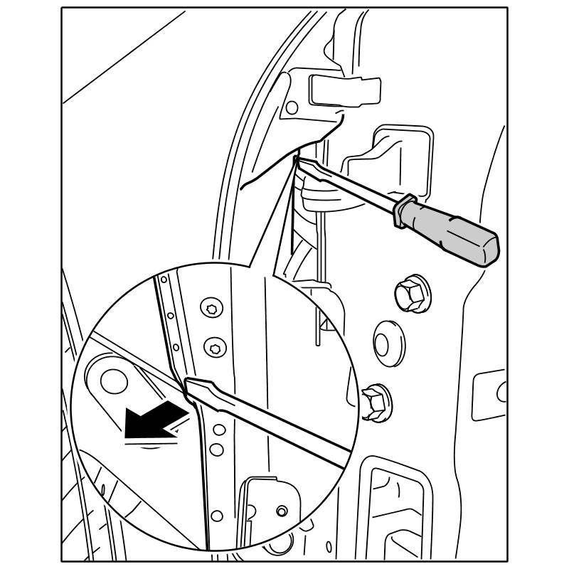 1. Position a screwdriver between the cut edge of the hinge pillar and wheel housing and tap it in approx. 10 mm with a hammer.