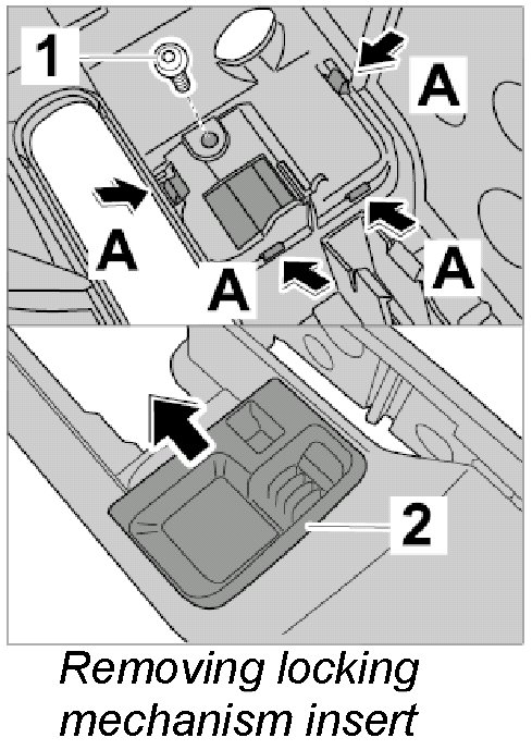3. Unscrew fastening screw -1-. Press in locking tabs -arrow A- and remove insert of locking mechanism -2-.