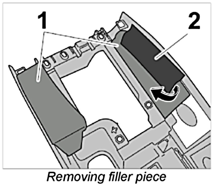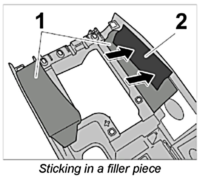 2. Position filler piece (sound absorber) -1- and use commercially available adhesive tape -2- to fix it to the centre console.