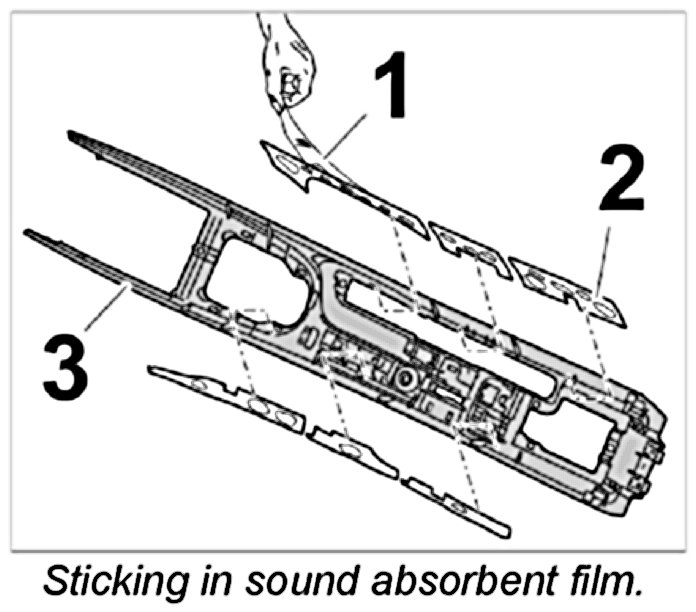 1. Remove protective film -1- from bonding point and stick sound absorbent film -2- inside the centre console -3-.