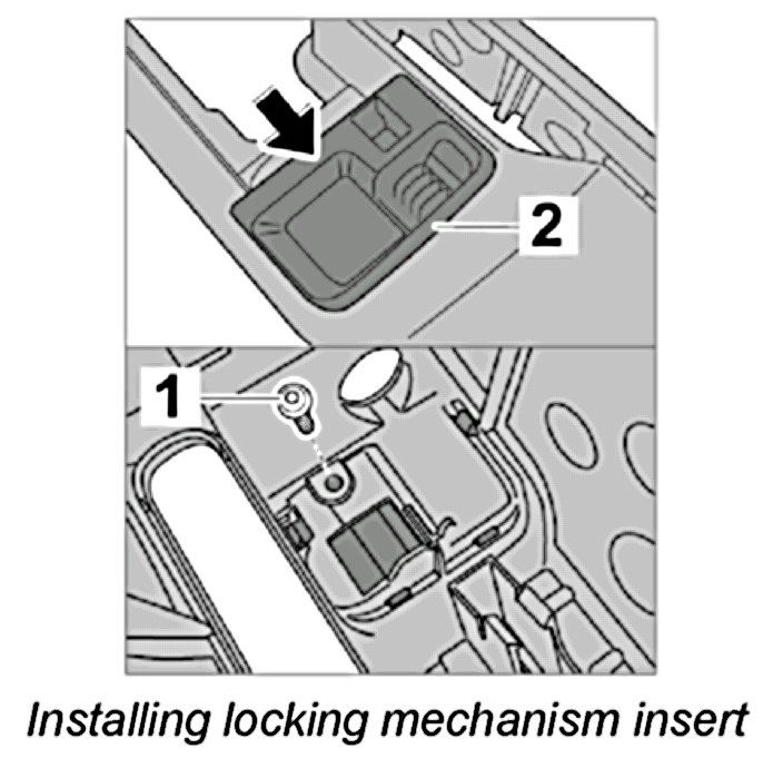 4. Press in locking mechanism insert -2- until it clicks into place and tighten with fastening screw -1-.