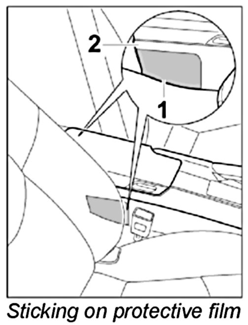 2. Stick protective film -1- to the left and right of the centre console -2- at the marked area.
