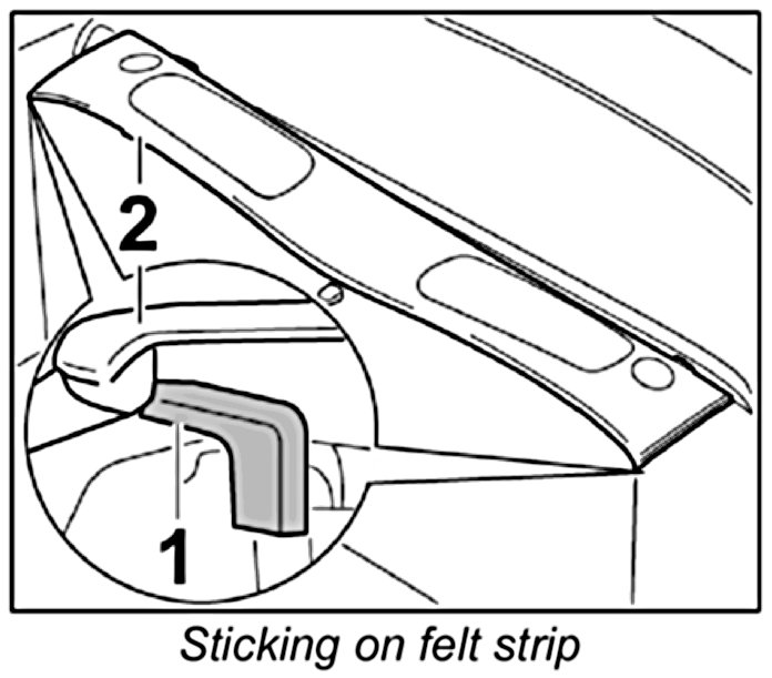 2.2. Stick a felt strip -1- to the bottom of the rear cover -2- in the area where it touches the rear side trim panel.