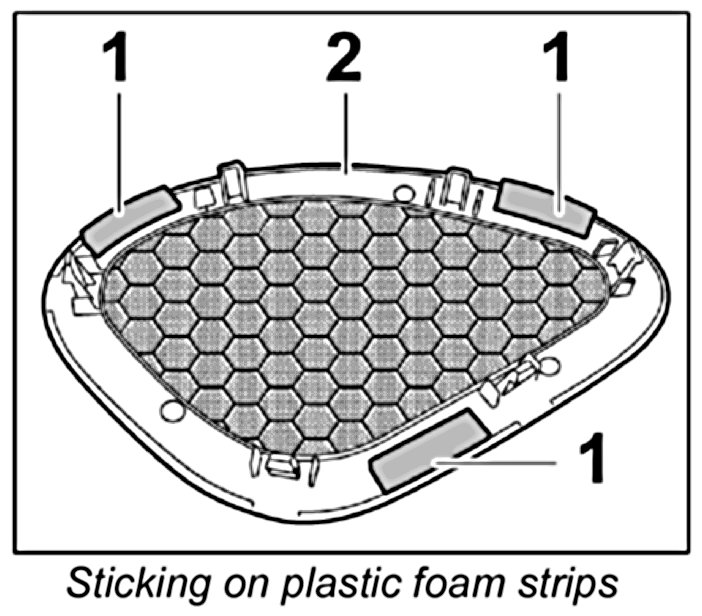 3.4. Stick plastic foam strips -1- to the marked areas of the loudspeaker cover grid -2-.