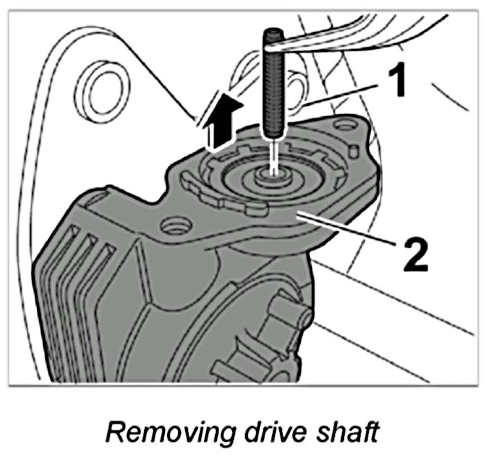 5. Pull drive shaft -1- out of the gear mount -2- and check for damage.