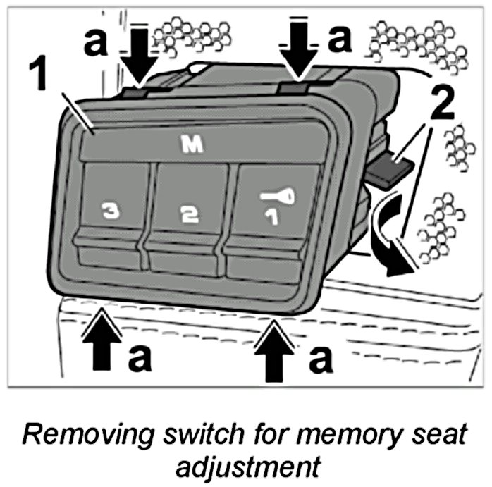 2. Release switch for memory seat adjustment -1- at the four locking tabs -arrows a- . Swivel switch for memory seat adjustment -1- out of the door trim panel at the clip -2- in -direction of arrow- .