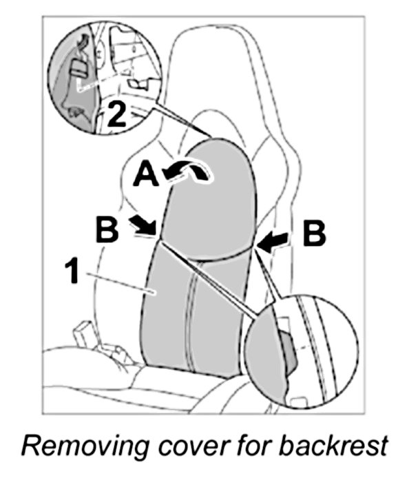 2. Insert your hand into the top of the backrest cover -1- and disengage it by pulling it up out of the backrest frame -2- (-arrow A-). Then press cover for backrest together slightly in the middle -arrows B- and pull forwards and out.
