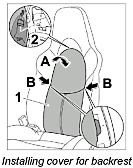 3. Press in cover for backrest -1- in the middle -arrows B- until the locking tabs engage -inset-.