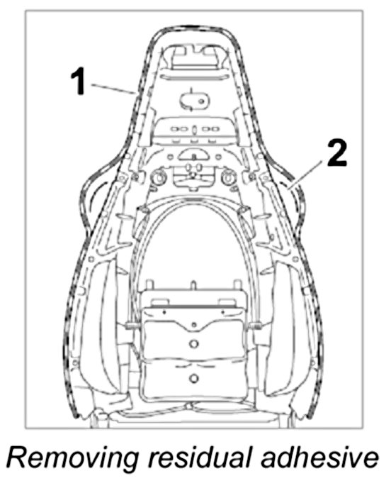 2. Remove residual adhesive -1- and clean sealing surface of backrest frame -2- with cleaning agent.