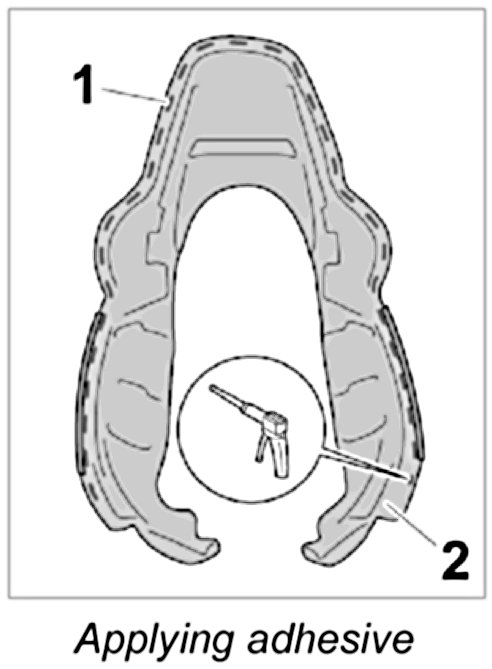1. Apply adhesive -1- to the marked area of the padding -2-.