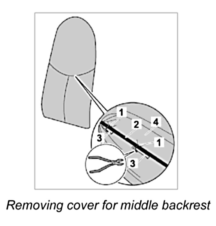 2. Cut through cushion clips -1- using side cutters. Detach piping -2- for cover for middle backrest and remove plastic frame -3- from the padding -4-.