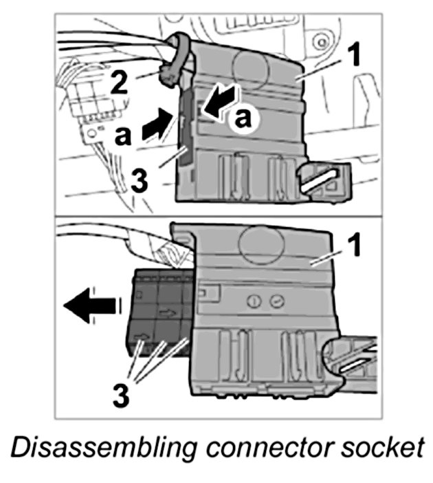 6. Release connector socket -1- (-arrows a-) and remove the three individual connectors -3-.