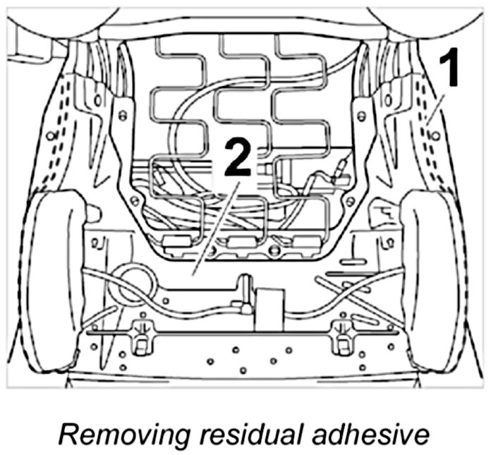 3. Remove residual adhesive -1- and clean sealing surface of seat frame -2- with cleaning agent.