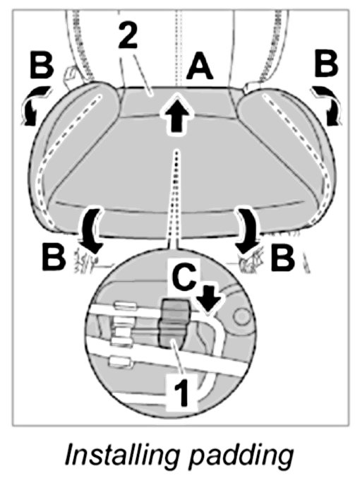 3. Clip in fixing clip -1- underneath the padding -2- (-arrow C-).