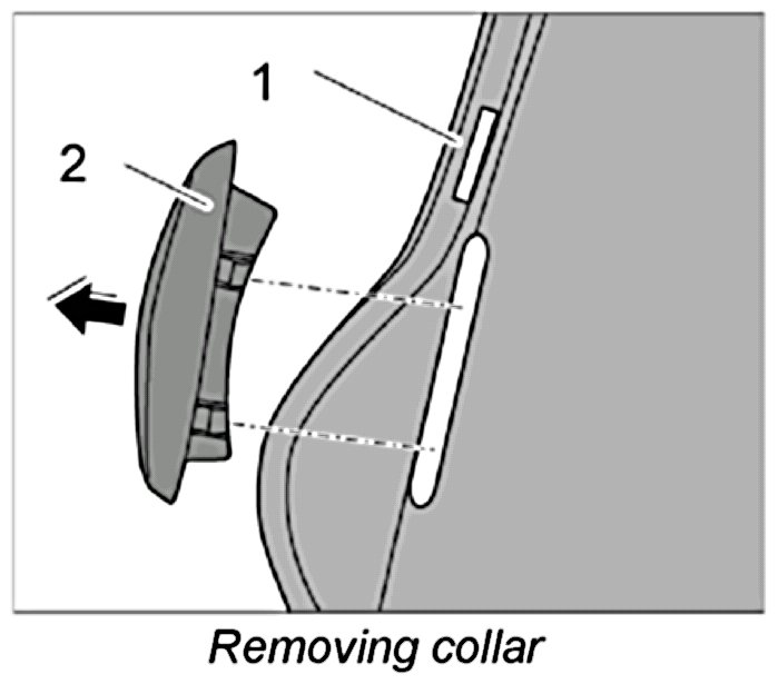 2. Insert a plastic wedge between the cushion carrier -1- and the collar -2- and unclip collar.