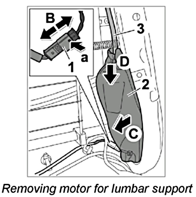 4. Take motor for lumbar support -2- out of the backrest frame (-arrow C-) and pull the hose -3- along with the motor out of the backrest frame -arrow D-.
