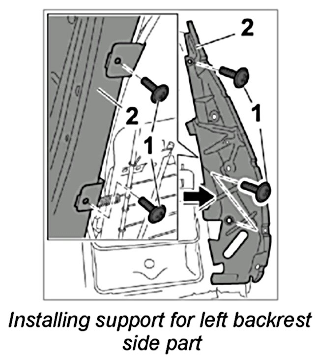 1. Unscrew the four fastening screws -1- and remove support for backrest side part -2-.