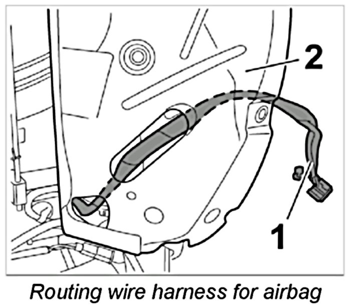 2. Route wire harness for airbag -1- as shown behind the backrest side part support -2-.