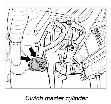 5. Remove clutch master cylinder -Arrows- and pin (master cylinder valve pushrod) - do not open the clutch system.
