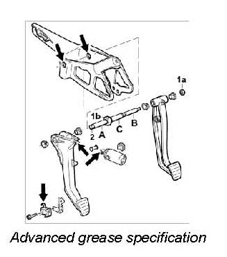 Grease bracket close to the pedal bearing axle -Arrows- with Renocal (Glissando VW 745). Part No. 000.043.206.21 (10g tube).