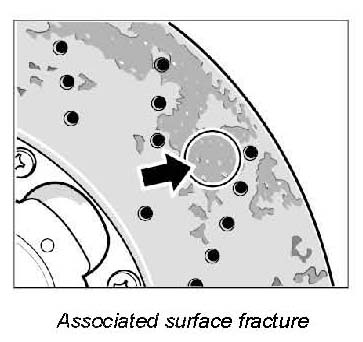 1. Friction area surface after normal brake load in road use. No surface fractures.