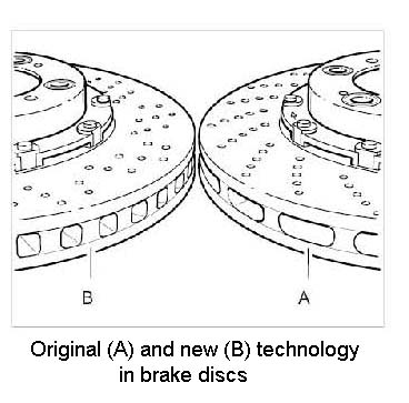 Ensure that brake discs manufactured using the modified technology -B- (used in the 911 Carrera 997 since production began) are not interchanged with the brake discs manufactured using the original technology -A- (911 Carrera 4S, 911 Turbo, 911 GT2, 911 GT3 - before model 2005). Distinguishing characteristic: Double the number of ribs between the friction surfaces in brake discs in which the modified technology is used -B- and modified perforated bore layout.