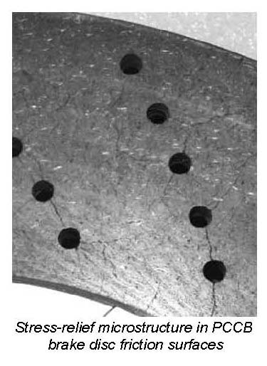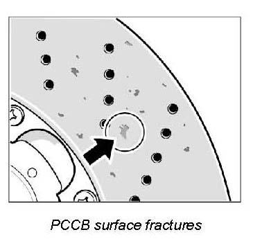 Cracks in the brake disc friction surfaces are viewed differently to cracks in cast iron brake discs. Cracks in PCCB brake discs do not constitute a wear criterion but exist already in new brake discs because of the way in which they are manufactured.
