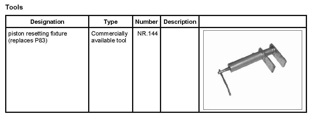 3. Push brake pads back slightly and evenly using piston resetting fixture (replaces P83) NR.144, see Workshop Equipment Manual, Chapter 2.4 -arrow-.