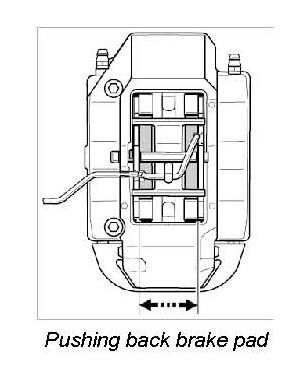 -> The brake pads must be replaced when the brake pad warning indicator lights up, but no later than when there is a residual pad thickness of 2 mm.